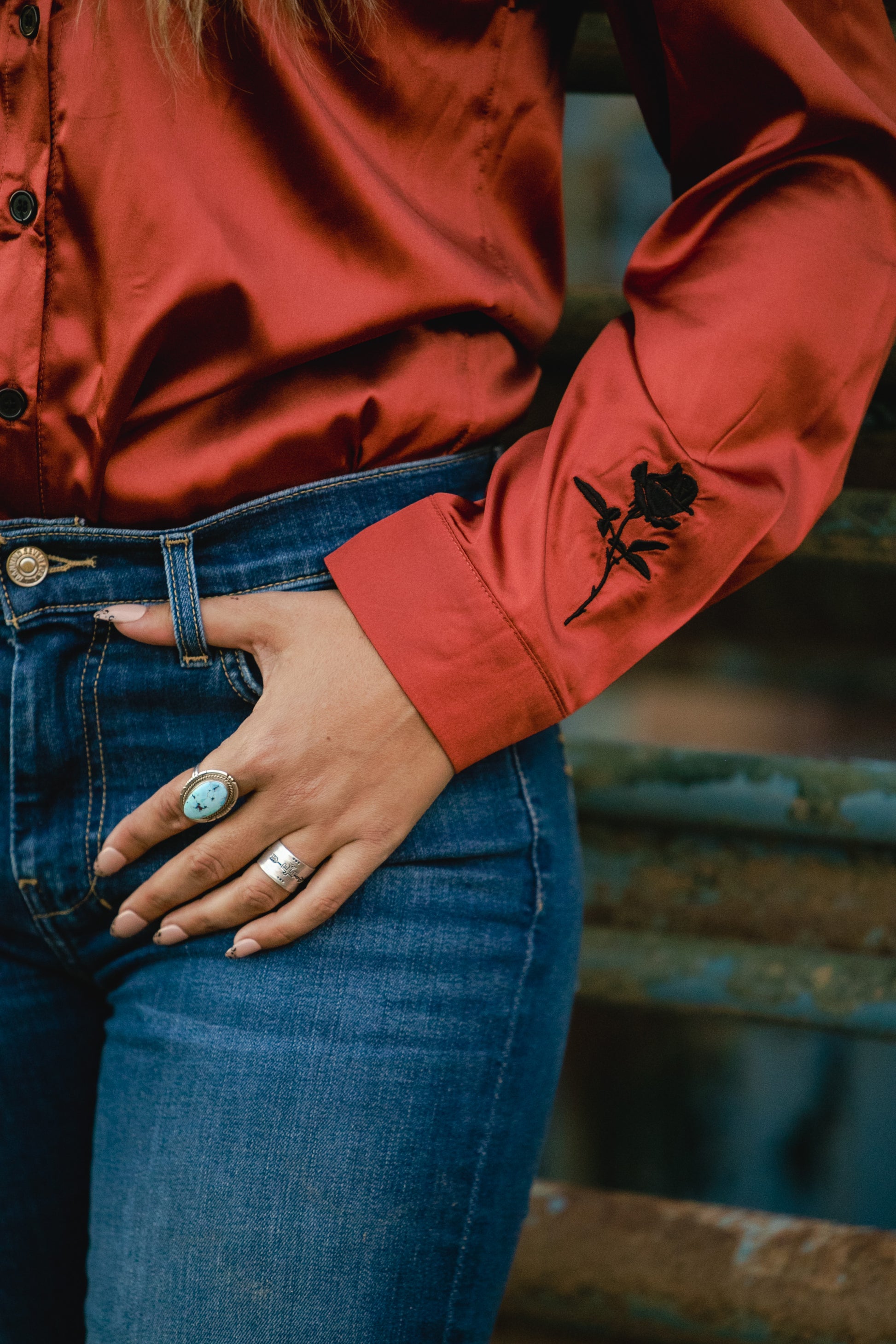 This Ivy's Rose rodeo shirt is made with poly satin fabric. They are soft, durable, lightweight and comfortable. The arms and body are designed to have extra length to ensure they do not ride up while you’re riding. Follow the measurements below to get your desired fit. Don’t miss our signature rose on the sleeve!